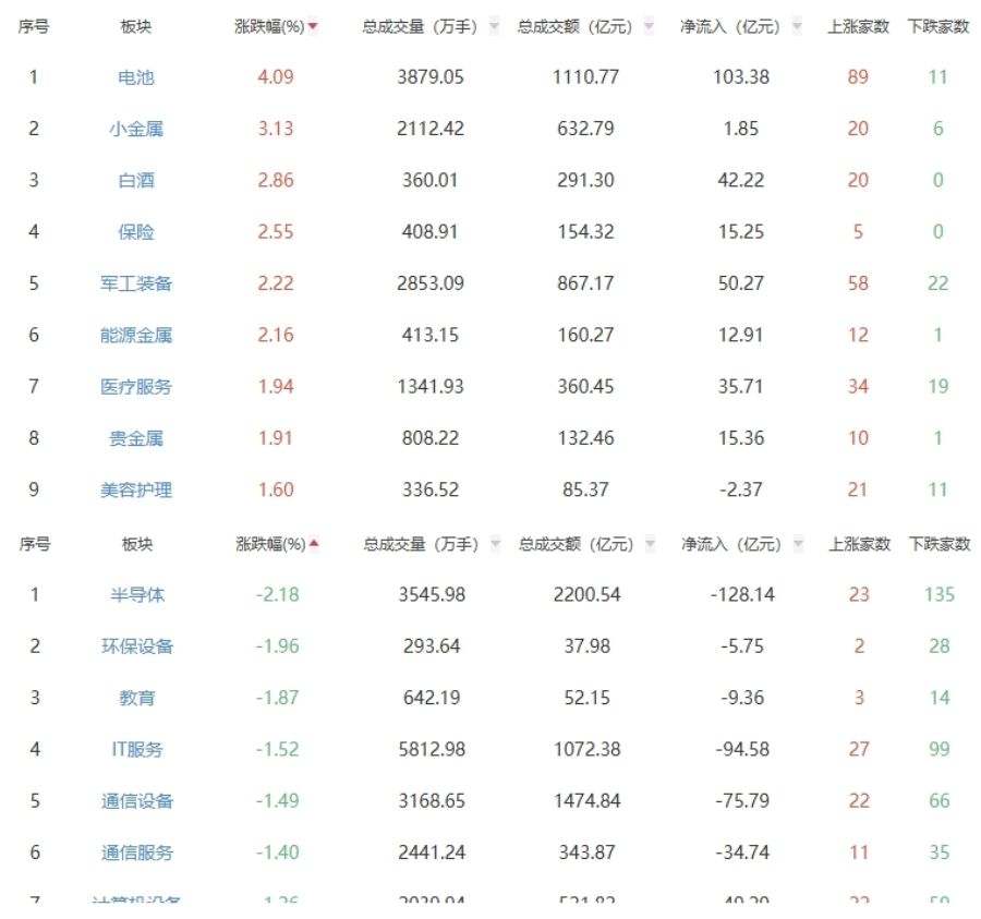 板块方面,电池、小金属、白酒等板块涨幅居前,半导体、环保设备、教育等板块跌幅居前。