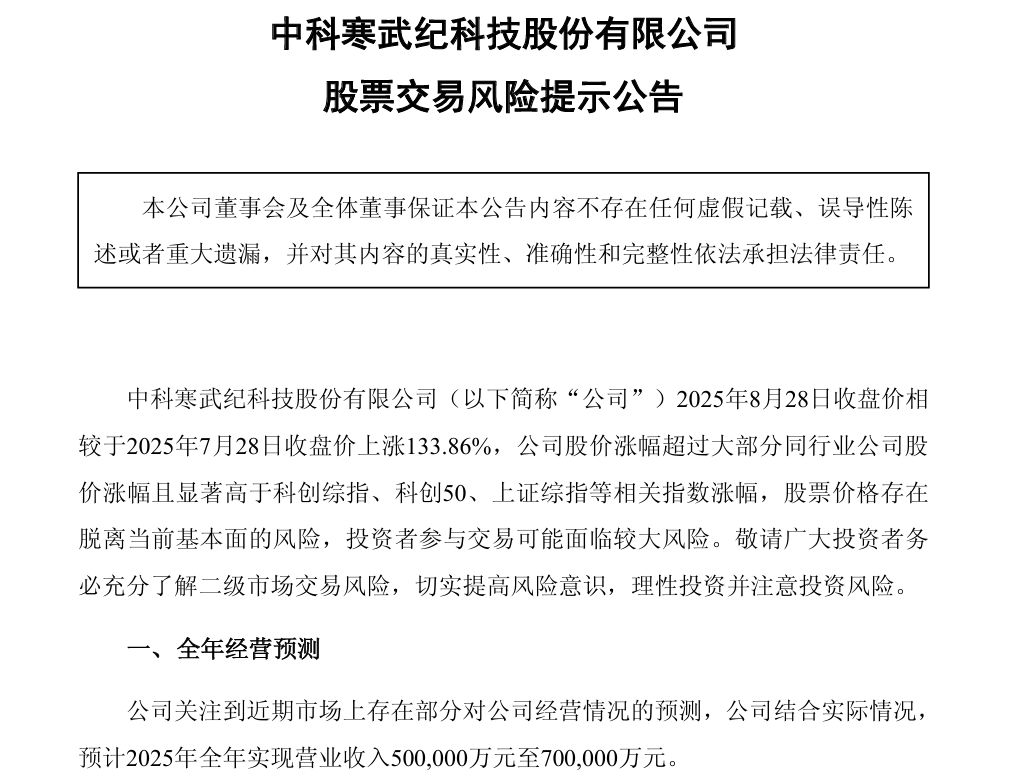 8月28日,寒武纪发布股票交易风险提示公告称,公司关注到近期市场上存在部分对公司经营情况的预测,公司结合实际情况,预计2025年全年实现营业收入50亿元至 70 亿元。