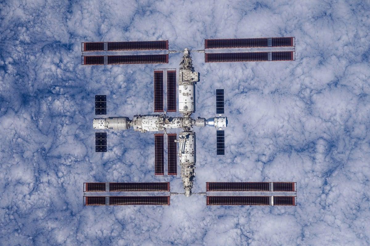2023年11月28日,中国载人航天工程首次对外发布由神舟十六号乘组返回地面前手持高清相机,通过飞船绕飞拍摄的空间站组合体全景照片。 中国载人航天工程办公室